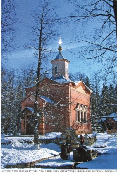 В 1887 году по благословению Калужского епископа Григория над колодцем, вырытым преподобным Тихоном, был построен деревянный храм на каменном фундаменте и с кирпичным цоколем в честь иконы Божией Матери, именуемой «Живоносный источник». Храм был пятиглавый и имел форму креста. К северной стене храма примыкали две купальни: мужская и женская. С юго-восточной стороны храма находилось одноэтажное деревянное на каменном фундаменте здание братских келий. С северо-западной стороны храма находилось здание для приезжающих богомольцев женского пола, соединенное внутренним коридором с женской купальней. Все здания и постройки, прилегающие к храму, были обнесены деревянной оградой. Колодец преподобного Тихона как место его подвижнических трудов и уединенной молитвы, освящаемое его постоянным духовным присутствием, издавна привлекал к себе многочисленных паломников. После закрытия монастыря (1918) храм на источнике преподобного Тихона и все скитские постройки конце 20х были полностью уничтожены, а место огорожено забором и обнесено колючей проволокой, чтобы не допустить паломников к святому источнику. Его замуровали бетоном, но тщетно: источник находил выход в других местах. Купальню накрыли бетонными плитами. Но даже в таких условиях, по архивным данным, в 1952 году Свято-Тихонов источник посетило 10000 человек из Калужской, Брянской, Смоленской, Московской, Орловской, Тульской областей и даже из Украины. Возрождение обители началось в 1991 году, когда 15 апреля Калужской епархии был передан источник преподобного Тихона и 15.5 га земли вокруг него. С лета того же года началось благоустройство территории и подготовка к строительству храма. 21 марта 1992 года архиепископом Калужским и Боровским Климентом было освящено основание храма в честь иконы Божией Матери «Живоносный источник», и там регулярно начали совершаться водосвятные молебны. В обители снова стала возноситься молитва, возрождаться духовная жизнь. 29 июня 1992 года в день празднования 500-летия блаженной кончины преподобного Тихона, Святейшим Патриархом Московским и всея Руси Алексием II был отслужен на Святом источнике водосвятный молебен. 30 апреля 1994 года была проведена первая литургия во вновь построенном на прежнем месте храме в скиту «Живоносного источника», а 17 сентября храм был освящен архиепископом Калужским и Боровским Климентом в сослужении духовенства г. Калуги и Оптиновой пустыни. В мае 1996 года была построена первая купальня на святом источнике преподобного Тихона. В храме в честь иконы Божией Матери «Живоносный источник» на святом колодце еженедельно совершается Божественная литургия и водосвятный молебен. 29 июня 1999 Патриарх Московский и всея Руси Алексий II совершил Божественную литургию в Успенском соборе и водосвятный молебен на святом источнике по случаю 200-летия основания Калужской епархии.