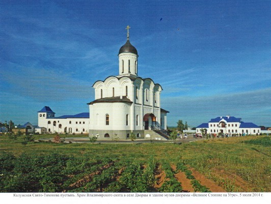 10 апреля 2007 года наместник Калужской Свято-Тихоновой пустыни архимандрит Тихон с братией на месте Великого Стояния на Угре, на окраине села Дворцы, освятил воды реки Угры и новый Поклонный Крест с иконами в честь покровительства Пресвятой Богородице земле Русской. 29 июня 2007 в честь 515-летия со дня блаженной кончины преподобного Тихона Калужского, митрополитом Калужским и Боровским Климентом совершено освящение фундамента храма в честь Владимирской иконы Божией Матери с нижним престолом во имя преподобного Сергия Радонежского в новоустраиваемом скиту на окраине села Дворцы. Освящение нижнего храма владыка Климент совершил 5 августа 2011 года. Сегодня во Владимирском скиту завершено устройство музея-диорамы «Великое Стояние на Угре». Картину Стояния написал художник Павел Рыженко на студии им. Грекова. Освящение диорамы совершил святейший Патриарх Московский и всея Руси Кирилл. Она будет напоминать всем о ратном молитвенном подвиге наших предков.